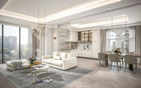 吧台隔断经常在餐厨区使用,从餐边柜延展出一个大理石吧台,分割餐厅与开放式厨房空间,但也保留了开放式厨房的社交功能,可以增进亲人之间的情感交流。除此之外,因为餐厅与厨房相连,这个吧台还能作为备餐台使用,出餐非常方便。