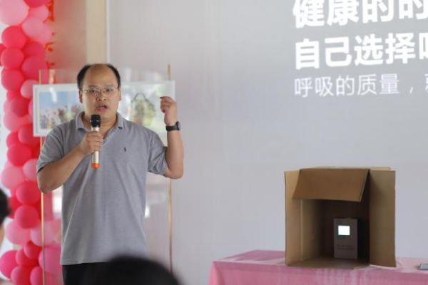 ——主题分享环节,九森宝 负氧离子空气源代表在纸箱内喷洒九森宝负氧离子喷雾,箱内专业检测仪器现场显示了喷洒前后的空气质量指数变化,以直观的体验方式,向现场嘉宾展示了九森宝 负氧离子空气源产品在提升空间负氧离子浓度、改善空气质量方面的出色表现。