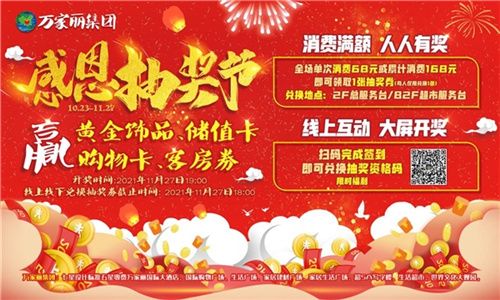 宇宙中心万家丽感恩回馈,“感恩抽奖节”火爆来袭!线上线下齐宠粉!即日起至11月27日,在购物广场/美食广场/生活超市单次消费满68元、累计消费满168元的顾客,即可至2F总服务台/B2F超市服务台领取人人有奖抽奖券!即日起至10月30日,线上加入粉丝群打卡签到,可兑换“感恩抽奖节”抽奖券和大屏开奖资格码,抽取感恩大礼包!更有机会赢黄金饰品、豪华客房券、中餐厅储值卡、超市购物卡等5大豪礼!100%有奖!更多活动详情,请关注“湖南万家丽实业集团”微信公众号!