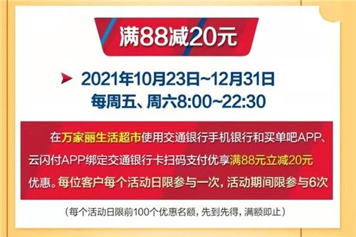 10月23日—12月31日,每周五、周六8:00—22:30,在万家丽生活超市使用交通银行和买单吧APP、云闪付APP绑定交通银行扫码支付优享满88元减20元优惠,还可同时参与随机立减活动,最高可减99元,名额有限,先到先得!10月30日—10月31日,积分兑换活动火爆来袭!抽纸、洗衣液等缤纷好礼等你来兑礼!万家丽生活超市位于万家丽国际MALL地铁层,地铁2、5号线直达卖场,每周二周三会员日享受全场商品8.5折优惠,更有不定期的好礼相送,要购物要囤货就来万家丽生活超市!