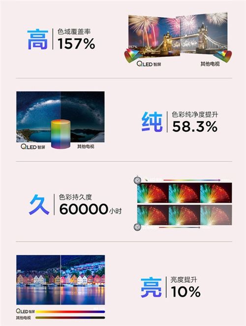 QLED之所以这么厉害,是因为QLED是 LCD 的全新技术升级,继承了 LCD 电视所有的优点,并在颜色精度、颜色亮度和色域方面都有了大幅提升。通过精准控制量子点的不同尺寸,使其在受到外来能量激发后,可以发出对应波长的光,因此采用量子点材料能实现非常纯正的 RGB 三原色。QLED 采取的无机材料也使其拥有长久的使用寿命。同时,在同尺寸的条件下,QLED 相比 OLED 能提供更亲民的价格。