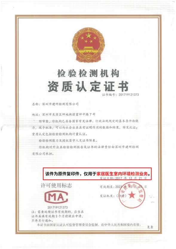 用户在采样完成后在网上填写信息将样本寄回实验室进行专业分析,检测进度及检测报告可在手机端直接查看,也可选择纸质报告寄送服务。家居医生的检测实验室是具有CMA(中国计量认证)资质以及CNAS(中国合格评定实验室认可)资质的深圳建研检测实验室,所有样本都会经由精密仪器进行专业分析,并由专家审核报告,数据更加权威、精准,其检测报告具有CMA标识和CNAS标识,因而具备法律效力,且其检测数据在欧美、亚洲等45个国家和地区国际互认,具有国际公信力,更加可靠。