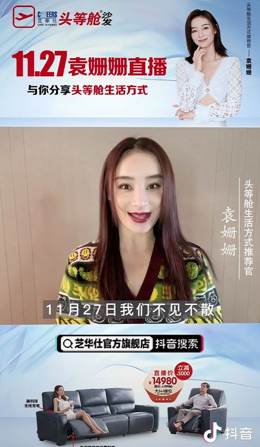 近日,芝华仕发布了一条抖音直播预告。在视频中,芝华仕官方表示,将会邀请袁姗姗来芝华仕官方抖音直播间,和芝华仕一起揭秘头等舱的生活方式。