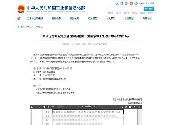 2021年10月25日,国家工业和信息化部公示了第五批工业设计中心的名单,维意定制赫然在列。