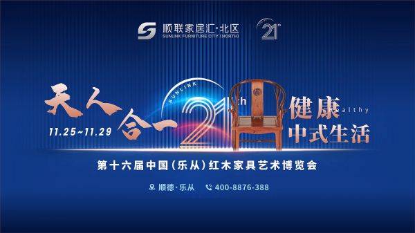 2021年11月25-29日,第十六届中国(乐从)红木家具艺术博览会,在顺德·乐从·顺联家居汇·北区如期盛启。博览会由广东省家具协会主办,顺联家居汇北区承办,作为乐从家具市场具有多年品牌沉淀的红木艺术博览会,每届都有精彩的亮点。本届则以“天人合一 · 健康中式生活”为主题,以中式空间艺术博物馆为艺术引导,结合中医养生角度,探寻四季环境与家居空间的关系,挖掘不同红木材质对应的养生功效。博览会集合新中式、红木家具、红木工艺品、文玩文创产品等,由“四季空间美学展览”室外展示区和50000m²大型高端红木室内展示区组成,既是商家展示精品的平台,更是众多红木家具爱好者不可错过的年度盛会。