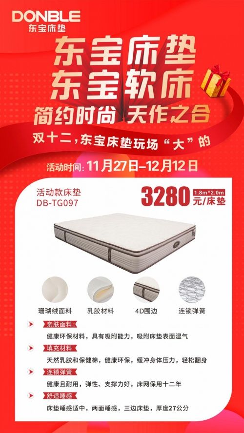 目前,东宝床垫“双12”正在如火如荼地进行当中,年末有家居装修计划的朋友千万不要错过哦!