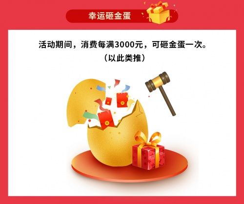 11月27日-12月12日到店消费,满3000元可获得砸金蛋机会1次,满6000元2次,上不封顶。金蛋内含丰富礼品。