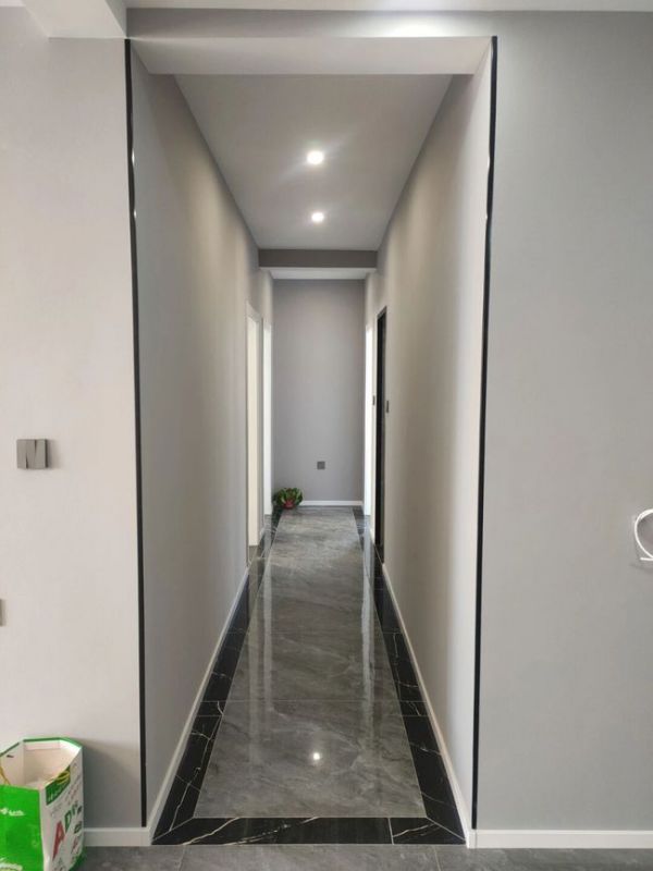 过道比较长了,地面选择做了黑色波导线条,视觉上更有线条感。顶面有房梁,安装了吊顶,可以把房梁藏住,显得比较美观。同时安装了几个筒灯,足够照明亮度,不会让人觉得刺眼的清理。墙面也是选择了灰色,与地面的灰色瓷砖刚好搭配,形成一个统一的色调。