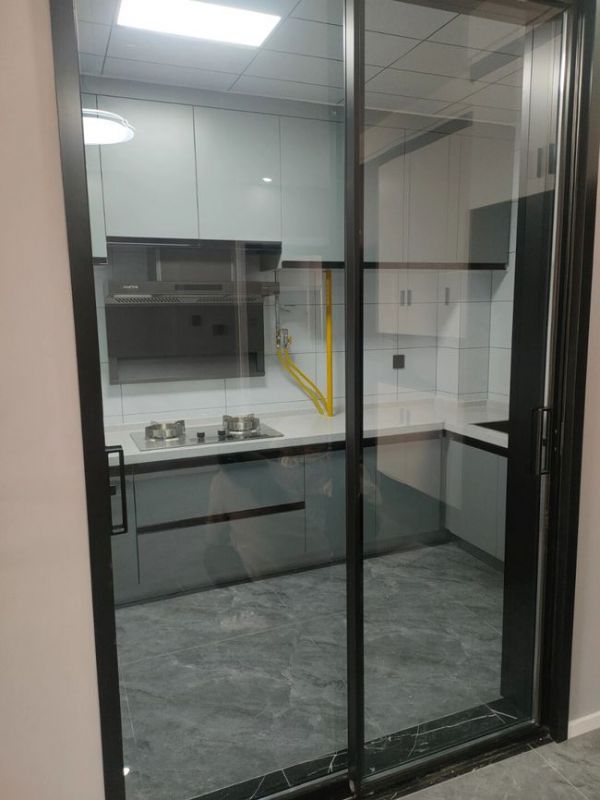 厨房选择安装了透明玻璃门,透过玻璃可以看到厨房里面,显得空间非常宽敞,不会让人觉得空间拥挤不通透的感觉。一般来说,现在都非常流行这种款式的厨房门,颜值很高,非常合适。厨房定制的橱柜质量跟做工都还不错,细节处理也比较好,以后能满足日常的三餐四季。里外全都打扫干干净净,可以说一点灰尘都没有。