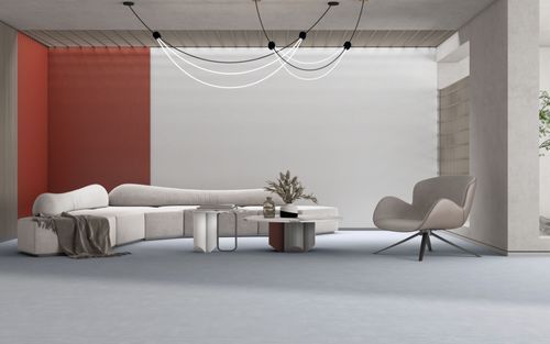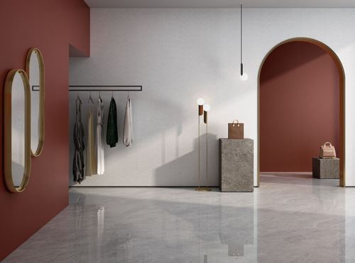 素淡的【锦绣华年】搭配复古的【绮裘红】打造高端商业场所,气质优雅的复古红搭配浅淡的灰白色调,呈现出轻奢精致的环境氛围,塑造高端大气的雅致空间。