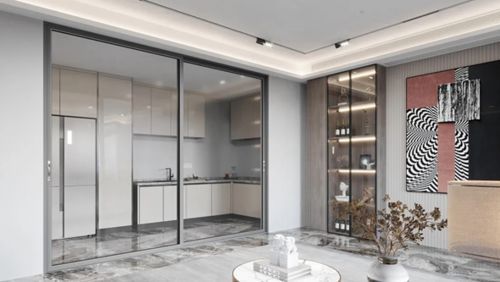 静享极窄推拉门刚硬的质感线条组合,任意搭配各种装修风格,大面积透明玻璃,让客厅与厨房空间无间连接,整个空间的流动性与通透度更好。