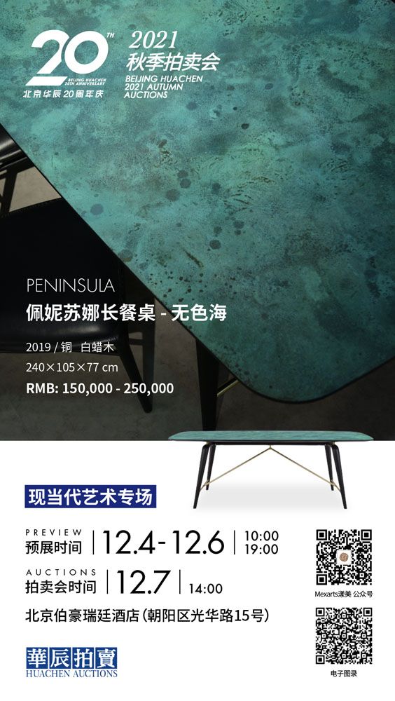 12月7-8日,北京华辰二十周年暨2021年秋季拍卖会将在北京伯豪瑞廷酒店举行,国际家居艺术品牌Mexarts漾美将携旗下名为“无色海”的Peninsula佩妮苏娜餐桌特别款,作为首届“生活美学”板块的代表作品列拍,带来现代家居设计品牌在拍卖会的首秀。