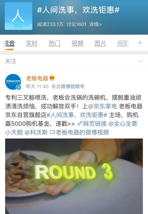 与此同时,作为厨电领域的资深玩家,老板电器通过精准洞察当代年轻消费者的触媒习惯,老板电器还在微博同步发起了#人间洗事,欢洗钜惠#的互动话题,为品牌和用户之间建立起了最佳沟通路径,成功激起网友们对本次“人间洗事”活动的热烈讨论和自发式推广,也为活动赋予了更多想象与可能。