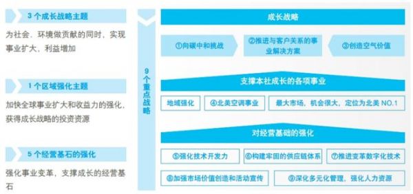 大金时刻关注全球可持续发展趋势,将可持续发展理念融入公司发展战略当中,以每五年为周期制定“FUSION”经营战略规划。在FUSION 20中提到“为抑制地球温室效应做贡献,2020年目标减少碳排放6000t-CO2/年”,而2020年,大金集团减少温室气体排放贡献量达7000万吨。2021年,大金集团正式推出“FUSION 25”,确定“向碳中和挑战”为三大成长战略主题之一,也进一步明确为实现2030年减排目标的实施计划。