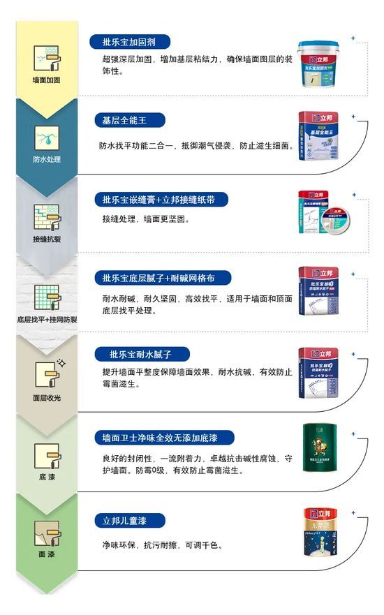 立邦全层涂装体系,从底部入手,加固、防护、平整、护色四大功能保障,打造真正从里到外的好墙面!全体系采用空气卫士技术,且全程无胶水添加,涂装后的好空气经得起权威检测。