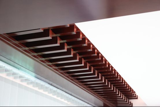 【曲鹏远】因为考虑到整个的入口是一个比较有仪式感的这么一个区域,所以我们对于原有的这个门斗的风格的设计,以及它的元素的采用,都是为了更好的容纳这个建筑外观整体的这种风格,包括整个院落的这种融入,内部呢我们更多的是采用现有的这种错落,让它形成共享与一层的这种层高不足的融合,也是为了让他更好的能步入式的这种感觉,或者是仪式吧,这样的话呢,从进门处的三米多的挑高,到共享的六米多的挑高,我们也是想让他从这种故事的这种感觉,通过层高,让他对空间有一种新的感受和认识,同时墙面上的一些造型的处理,包括我们之前的这个结构上的一些梁和柱的这种关系的处理,做了很多的这种处理手法,目的也是让他除了让这个空间能有一种氛围以外呢,我们更多的是想把一些建筑本身不足的地方进行一些弥补,来达到我们想要营造的效果。