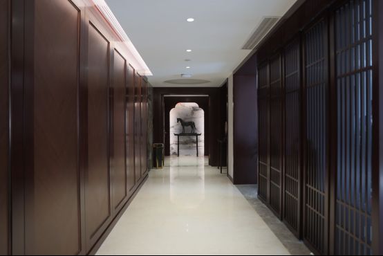 【曲鹏远】他的一楼宴会厅呢是用于接待用的,当时我们在考虑宴会厅的接待人数的问题上,我们考虑选择这个位置放在哪会更合理,最后我们选择了一个靠近院落的这么一个角落,第一个是这个空间能满足我们想要满足的接待人数的需求,第二个我们说在就餐的时候呢,我们希望能看到室外的这种景观,园林,因为在这个位置来讲,我们说有一个院子是非常奢侈的,那这个奢侈的空间,我想除了人可以进去赏花喝茶以外,那更多的是我们可以让朋友在一块享用,那这时候可能更多的是让他通过视线的延伸,能看到院落,这也是表现了主人对于宴请的客人的一种尊重,以及一种情怀的表现吧。