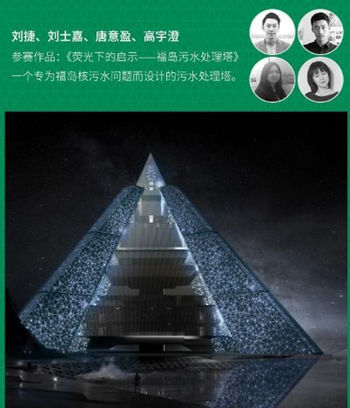 最终职业组刘捷、刘士嘉、唐意盈、高宇澄团队凭借作品《荧光下的启示-福岛污水处理塔》赢得了总决赛职业组冠军。该作品设想通过放射性水处理系统转化成电能,以及利用三氧化钛的放射性制造荧光,用点点荧光呼吁人类提高对核污染的认知,警惕真正核灾难的来临。