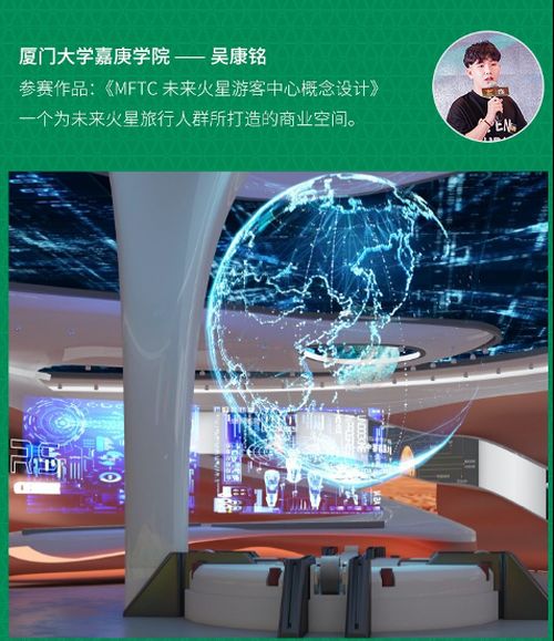 来自厦门大学嘉庚学院的吴康铭凭借作品《MFTC未来火星游客中心概念设计》赢得了总决赛学生组冠军。该作品通过建筑的造型、空间功能、光的设计结合交互技术,完成一个完全属于火星本土元素的建筑空间。