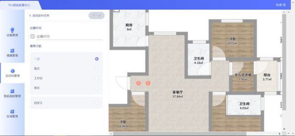 与传统照明设计不同,“智能照明设计云平台”在设计师、实施服务方和用户三方之间建立起一座桥梁,在需求分析与灯光设计的阶段,用户可以与设计师一起通过云设计平台,亲自参与到房屋灯光设计。用户可以提出自己对家庭灯光的使用场景、喜好、风格的需求,并且可直接提供一份房屋的户型图文件。设计师针对用户的真实户型进行设备点位、灯光效果、智能情景的配置,配置完成后可以直接生成专业的灯光伪色图、场景预览图、施工图和产品清单报价等图文信息,以及灯光效果动画、360°漫游可视化灯光场景等视频信息,让用户真实看到不同情景模式下灯光的呈现效果。