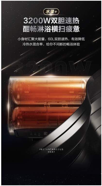 美的电热水器TQ6(HEY)的3200W双胆速热功能让你纵享酣畅淋漓的沐浴体验。60L双胆速热洗可任你自由选择单胆速热、整胆加热两种模式,单胆模式快速加热,适合人少快洗,高效节能不费电;双胆模式上下胆同时加热,水量充沛,可以满足多人畅快沐浴,灵活变通,10倍热水量能够满足你的日常所需。