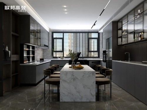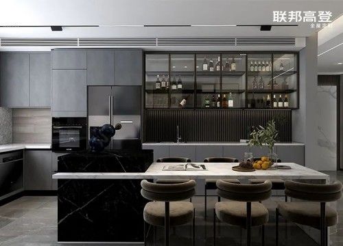联邦高登这款轻奢风餐厨一体设计令人不经眼前一亮,空间整体以U型功能区划分,餐桌延伸吧台设计于中心,空间隔而不断共享烹饪、享食乐趣。柜体入墙电器内嵌,释放收纳潜能且观感整洁美观。最后上方搭配了精致黑框玻璃柜,美酒、藏品了然于心,路过是忍不住的瞩目张望。