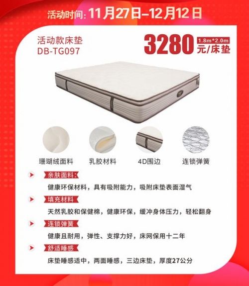 看活动,当然要先看产品。本次双十二,东宝床垫限时推出一款超高性价比的床垫。这款活动床垫采用珊瑚绒面料,具有羊绒一般的细腻触感,恒温保暖,长效保存热量。在寒冷的冬天里,珊瑚绒床垫能够让你睡觉时“温暖如春”。