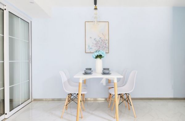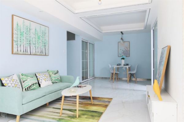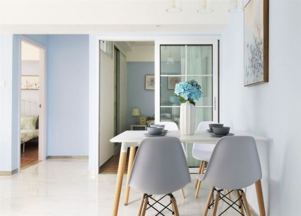 客餐厅一体效果图~天蓝色的墙面带来小清新的美,也带来自然舒适的味道~而且我们可以看到客厅里的这个浅绿色的沙发与天蓝色的墙面虽然是有点相似,但也还是很配的呢~