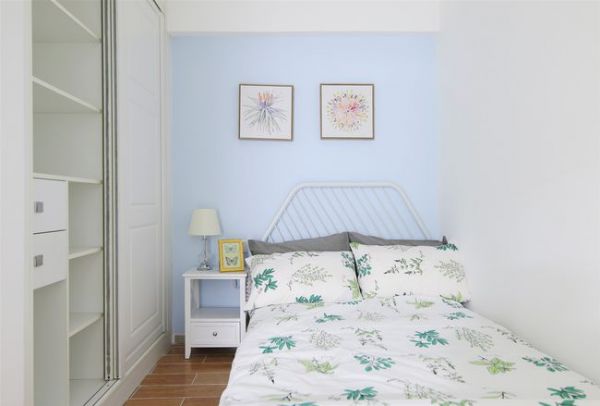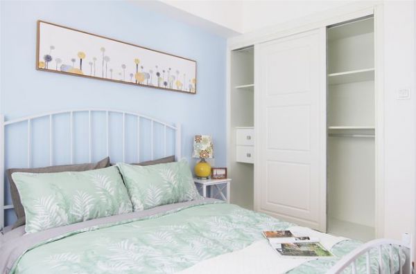 主卧床头背景墙也是天蓝色的,然后衣柜定制的是米白色的,还有床也是白色的,然后床品浅绿色,这样的搭配看起来特别的舒服~而且也不缺美感