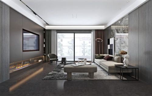 年轻人对于自己房屋的设计总会有自己的想法;深棕色的大理石砖铺设了整个地面,墙体部分则选用了灰色的装饰板搭配大理石砖拼接而成,所对应的电视墙则选用了深棕色装饰板构成。米白色的主体沙发搭配一款单人沙发凳放置于客厅中央,小资情调瞬间迸发。