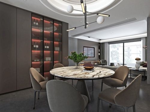 餐厅中央放置了一个白色+深色花纹的圆形大理石材质的餐桌,在其周围围绕着多把深灰色布艺座椅,足以满足多人用餐的需求,头顶设计了一款造型独特的吊灯,时尚感满满;餐桌一旁设计了一款棕色等墙高的餐边柜,多个玻璃格间方便日常收纳物品,红色的内衬简直不要太惊艳!