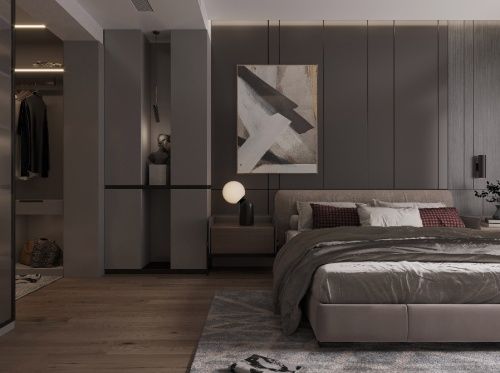 卧室部分很好地呼应了整个房屋的色调,以深灰色搭配棕色构成,一款布艺软床放置我是中央,背后主墙则选用了深灰色的装饰板铺设,一副亮色的艺术画点缀其中使房间更富活力;床下一款灰色地毯铺设,保证了卧室的舒适性。