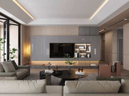 客厅部分,他们采用了不常见的水泥灰色搭配棕色木板搭配设计,整体电视墙看起来非常别致,不仅满足了我父母这样的上了年纪人群,而且在我看来也非常时尚;深灰色的地毯上放置了黑色的圆形茶几,能让老两口的生活过得非常惬意。