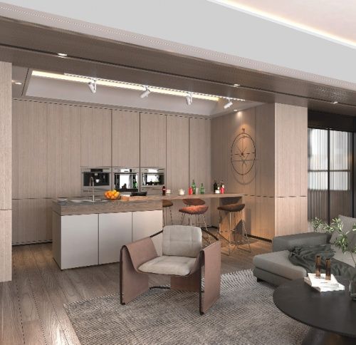 厨房部分采用木色完全填充,一体式设计使房屋看起来更加宽敞,一体式的橱柜完美地把现代金属厨房用具包容进去,形成了一体。中间设计了一款小型吧台,也算是我一个私心,有机会过来住的时候我可以在此喝点儿小酒放松一下,高脚椅设计能让多人在此聊天,非常方便。