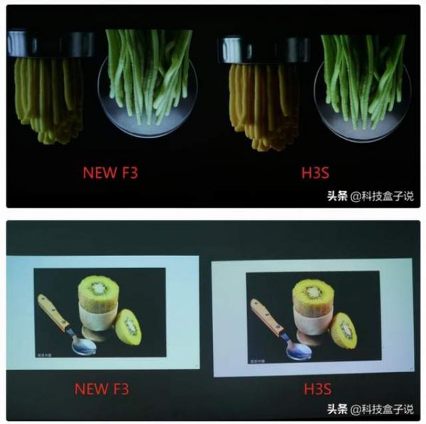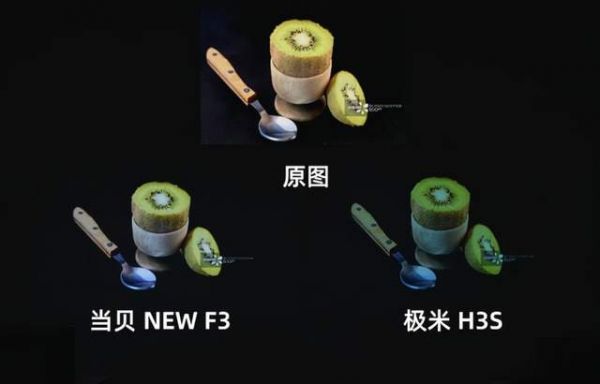 原文笔者将极米H3S和当贝NEW F3直接对比图放了出来,并没有和原图进行对比,单单从两两对比来验证,个人觉得这个对比方法比较片面,一点也不严谨。然后将原图和它们对比后,大家其实不难发现当贝NEW F3的画面色彩更接近于原图,不知道是我的拍摄手法还是其他原因,极米H3S的画面颜色和原文中的颜色不一样(难道调了画面色彩?),极米H3S在画面上绿的过于明显了,看得我都不想再吃猕猴桃了。