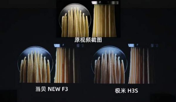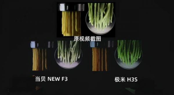对照之下,眼尖的朋友应该能发现,当贝NEW F3在黄色色块的展现部分并没有发灰,也最大程度的还原了原视频的色彩。对比极米H3S,从对比图能明显看到它在颜色上偏红发橘,绿色的问题还是和上面的猕猴桃一样,我几乎要把绿色面条看成长豇豆了。