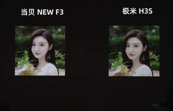 我们再拿出一张人物的对比图来看,从这张对比图来说,当贝NEW F3在画面的亮度上不亚于极米H3S的2400ANSI流明的亮度,同时当贝NEW F3在画面细节的刻画上更为清晰,把大甜甜的甜美容颜完美的表现出来。