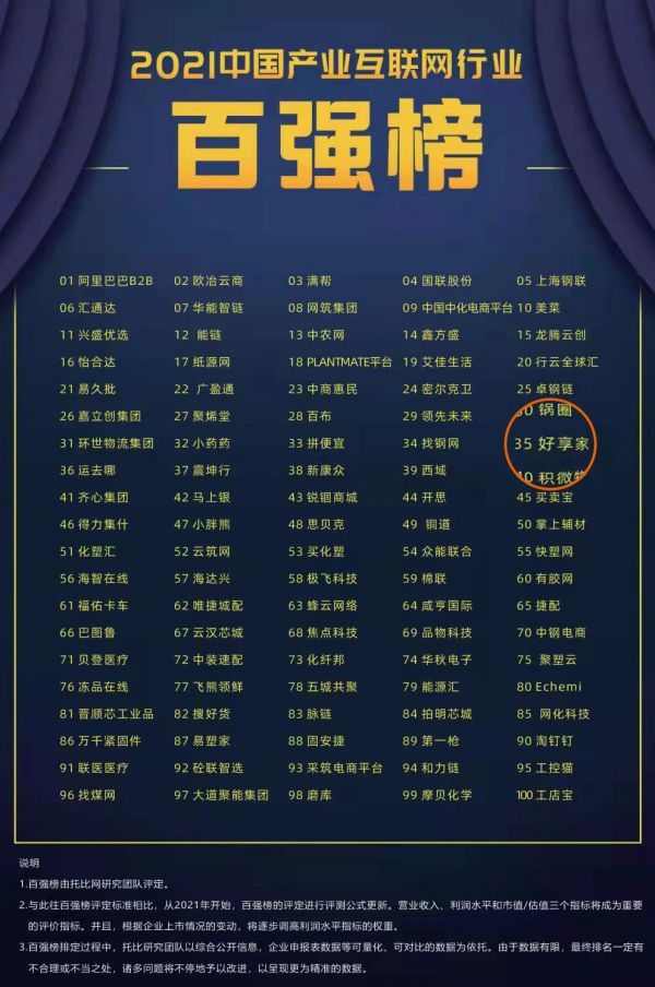 好享家在本次大会上再次上榜“2021中国产业互联网行业百强榜”,排名上升至第35名,较去年上升32位次。同期,好享家荣获 “2021南京产业互联网创新企业”。此前11月,好享家凭借自身的创新能力和数字化优势,被江苏省商务厅认定为“2021年江苏省数字商务企业”。