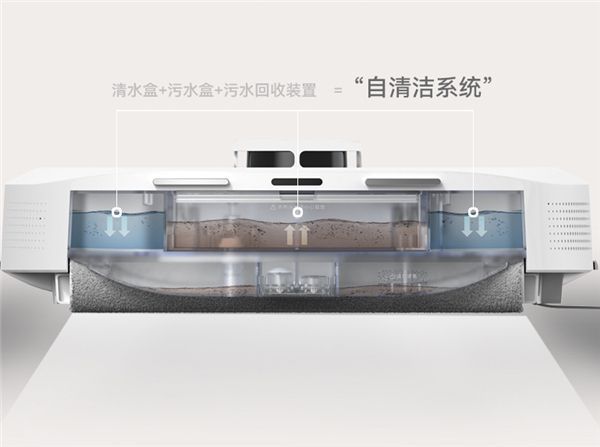此外,基站配备了一套深度清洁系统,该系统由清水、污水桶、拖布清洗装置、风干装置组成。当基站感应到机身清水差不多用尽,污水盒快满时,自动召回机身。首先回收机身上的脏污,然后向拖布喷洒清水并进行高速反转清洗,清洗完成后进行风干,清洁度和风干率高达99%,由此保证了拖布时刻保持干净。