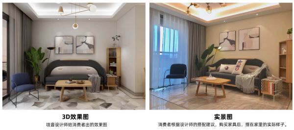消费者可在线与专业设计师,进行1对1沟通。设计师根据消费者家的户型、硬装实景、风格偏好等实际情况,并根据其个人喜好,推荐适合的软装家具,并通过3D设计工具,将其摆放在1:1还原的3D实景中,让消费者能够在线预见家具放在自己家里的样子,由此实现【所想即所见】。