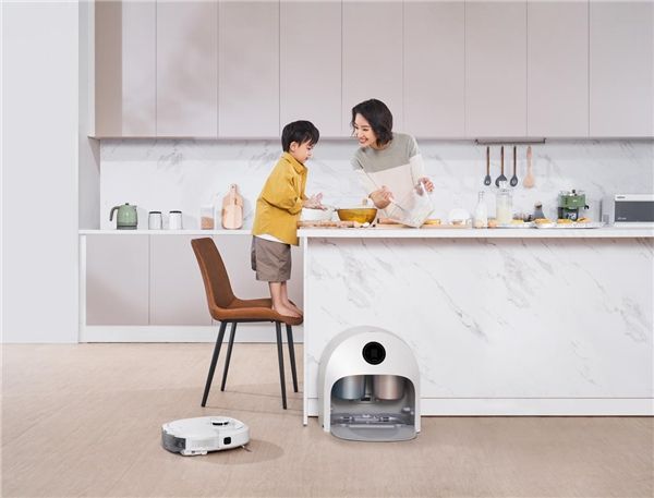 除了两套清洁系统外,晓舞还具备扫吸洗拖收,全自动五合一功能,只需要按下启动键,就可以开始全屋清洁。