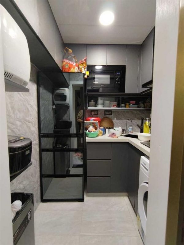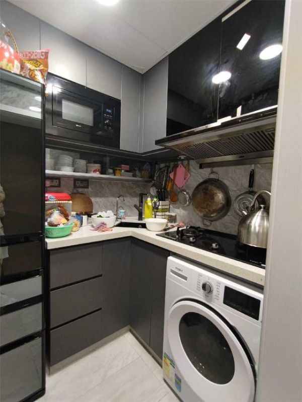 夹角的水槽倒是节省了一定的空间,空出了一处台面空间;且洗衣机、冰箱都嵌入了橱柜中,倒是干净利落。