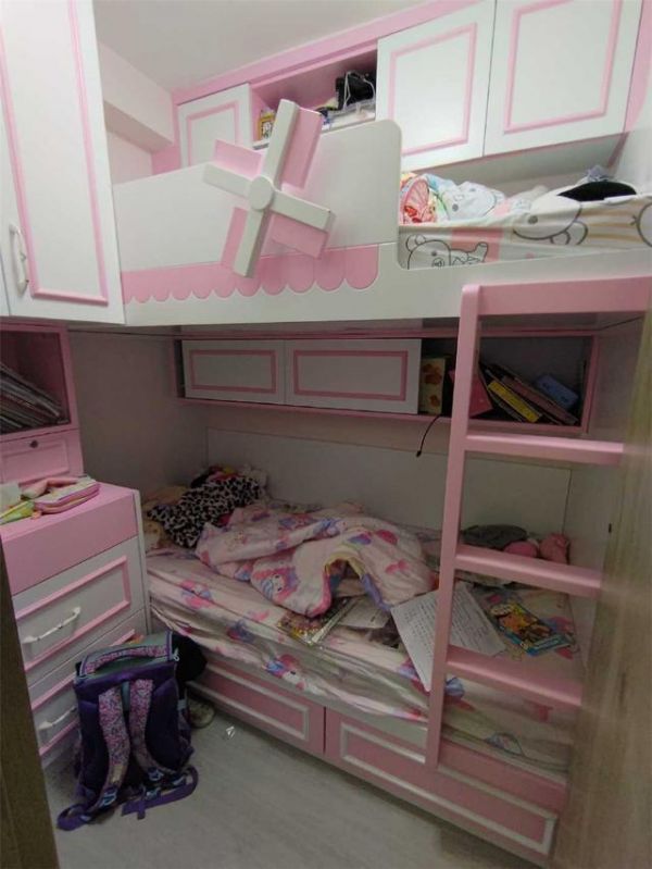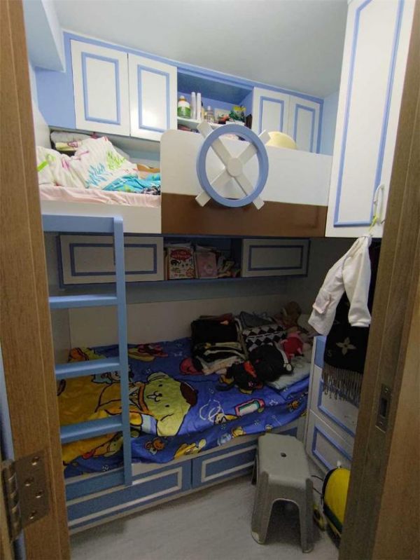 而电视柜左手边这间,格局也相差无几,差不多是“镜像”的房间,也是上下铺+柜子的设计,将纵向空间充分利用了起来。