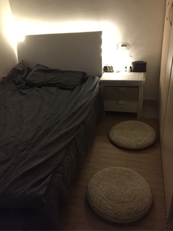 地面原本是贴的瓷砖,墙壁也是白色,还没有吊顶,整个房间给人的感觉非常阴冷,在网上买了一套深色的床上三件套,在地上贴上“实木”泡沫地板。瞬间感觉温馨了许多。