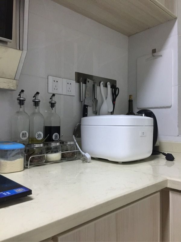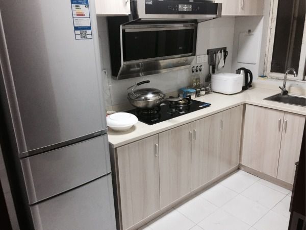 厨房面积很小,下面还有柜子,做嵌入式的似乎有点不太可能,就没买微波炉和烤箱,节省空间,看上去才不会很乱。