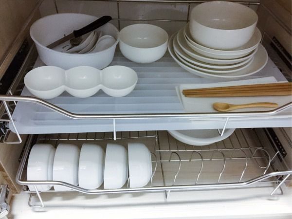 墙壁上装上挂钩,将厨具都挂起来,节省空间,看上去也很美观。调味品用盒子收起来。菜板用的塑料,因为基本上不会用到剁砍,收纳也必较方便。