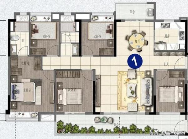 整体动静分离清晰,休息区有四个卧室,南北分别平均布置。北向两个次卧和南向次卧形成品字形的犄角之势,距离北侧干湿分离的卫生间近在咫尺。