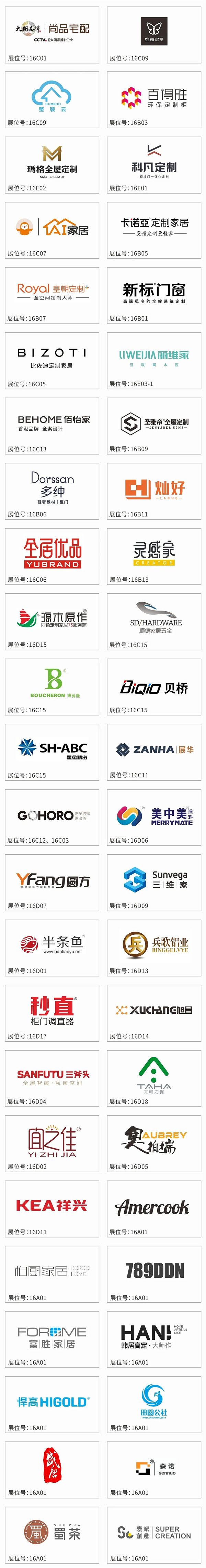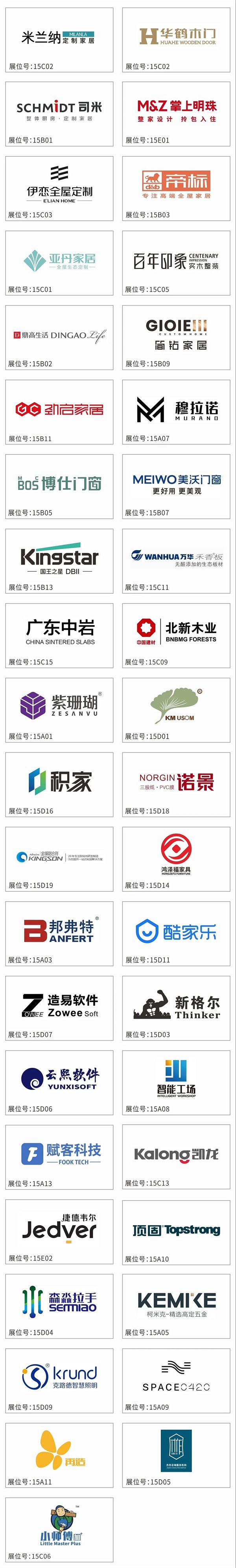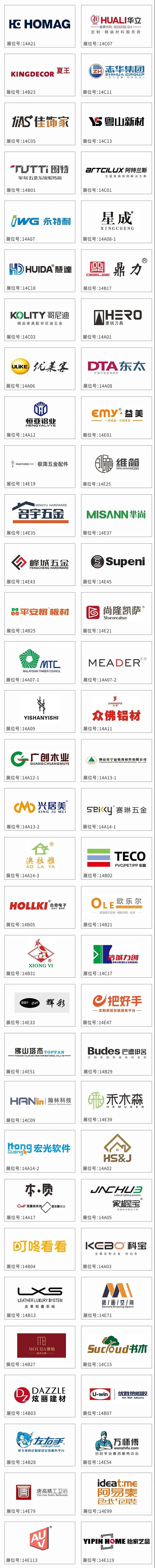 3.装饰材料/移门/门板/软件/设计/平台(1)装饰材料:兄奕、佳饰家、华立、瀚林、科宝、夏王、马来西亚木材理事会、广创、特客、隆兴上、巴德伊舍、塔杰、鲁班创美、小代、澜峰、博众、酷享、莞固、德东、金邻居、中晖创家、兴居美。(2)移门/门板版块:星成、凯萨、鑫德、博达匠心、奕简。(3)软件/设计/平台:叮咚看看、左右手、模装科技、秒画空间、万师傅、e把好手、宏光软件、阿易泰、书木。