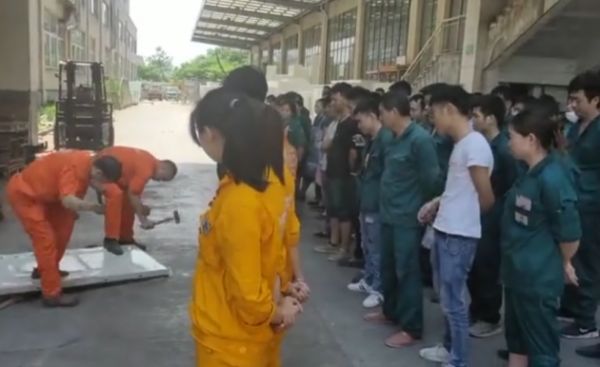 某日,王力质检人员在检查产品质量时,发现一樘不合格的门,通过门上独有的“身份证钢印号管理”,追溯到相关责任人。领导们当场商议决定将这樘不合格的门就地销毁!于是在所有车间员工的见证之下,相关责任人亲自抡起大锤将门砸烂,予以警示。