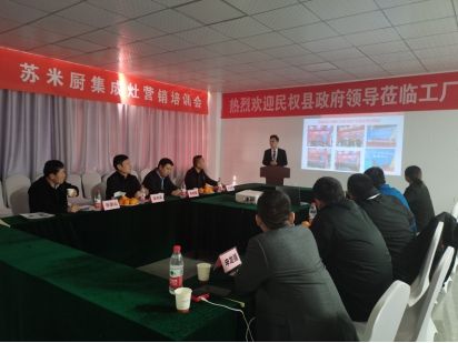 参观后在苏米厨二楼会议室召开了座谈会,嵊州市苏米厨电器有限公司董事长崔总欢迎词,销售部李总向领导一行介绍了公司品牌的发展历史和发展规划,县政府领导介绍了民权县的发展历史和优势,诚邀公司到民权县考察。